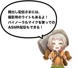 通常のマイクの他にバイノーラルマイクもございますので、それらを使って音質の良い声を配信することもできます。