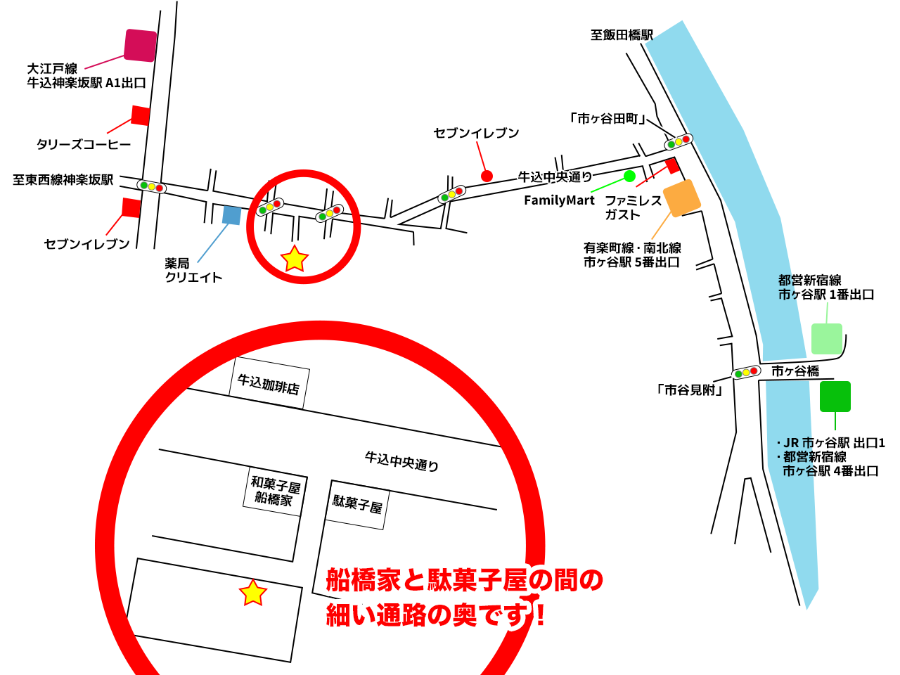 - ・都営大江戸線 牛込神楽坂駅 A1出口より、徒歩5分